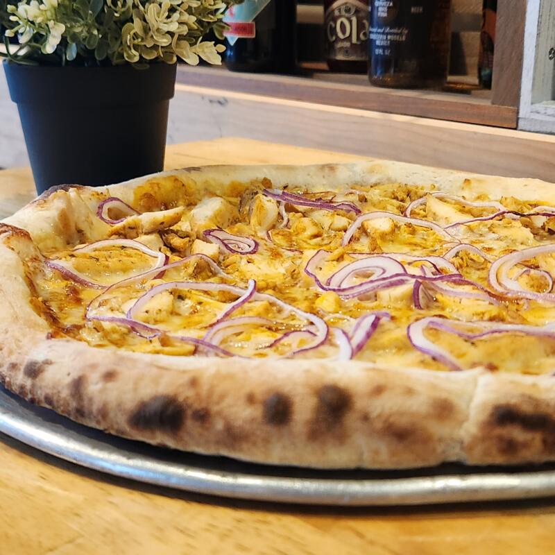 Tomato sauce, mozzarella, chicken, bacon, red onions, BBQ sauce.
